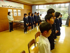 ↑ 新しい登校班の約束を決めました。登校班では、すでに先頭は5年生が歩いています。・危ないところへ行かない ・バスの運転手さんにも聞こえる声であいさつをする・並び方を守って、離れないで歩く・班長は後ろの人が遅れていないか確認する等、それぞれの班の約束や集合場所、集合時間を確認しました。「笠野の子は地域の人にもしっかりあいさつして、気持ちがいいですね。」と、私に伝えてくださる方がいらっしゃいます。とてもうれしいです。上級生が見せてくれるお手本を受け継いでいきましょう。