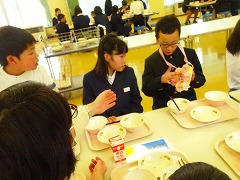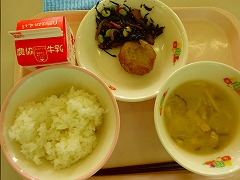 ↓ 全国学校給食週間 今日は能登献立,中島菜のピラフ、出世魚のふくらぎのフライ、豊かな海の恵みのわかめのスープです。明日はオーストラリアの献立、これも楽しみです。