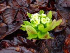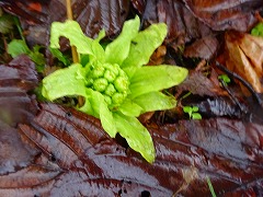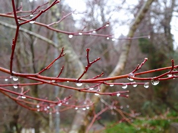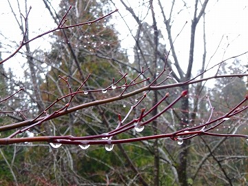 ↓ 今日の水滴も芸術的です。笠野の森の木々の新芽も色味を増してきました。