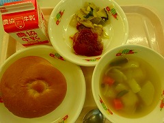 ↑ 全国学校給食週間 今日はオーストラリアメニューで。オージービーフの入ったカレーと、シーフード入りのサラダ、それにオレンジです。オージービーフは低カロリー、低コレステロールだそうです。月曜日は金沢メニューです。またまた、楽しみです。