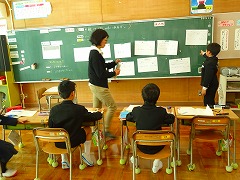 ↑6年国語 自分が思い描く新しい暮らしの在り方と筆者の自然を生かした暮らし方を比較する文章を書いています。個別に思いを聞き取り、下書きを推敲する中で、思いがはっきりしてきます。