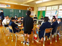 ↓2年生 来年度の見通しを持つために先生のお話を真剣に聞いています。 ↓1年生は 教室の整頓をしています。机の名前シールをはがし、新1年生が気持ちよく教室を使えるように整えました。掲示板には、新1年生がうれしくなるような掲示もしました。約2週間後には、もう入学式です。