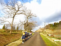 ↑ 雪を頂いている遠山は、春の日差しを浴びてまぶしく光っています。今朝は穏やかな笠野の通学路です。