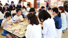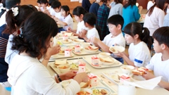 笠野公民館にて,児童14名と保護者が参加して,親子料理教室を行いました。お世話してくださったのは,町食生活改善推進員の方々です。この日のメニューは,ロールサンド,きゅうりとトマトのかんたんサラダ,小松菜の米粉むしパン,スープです。スープ作りでは,塩分濃度計を使って塩分を測定しました。汁物のちょうどいい塩分は0.6~0.8%だということ,塩分の多いものを食べると,血管が疲れて傷ついてしまうことを学びました。参加してくださった皆様,ありがとうございました。