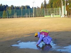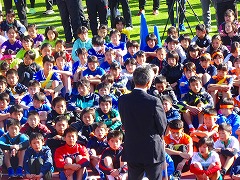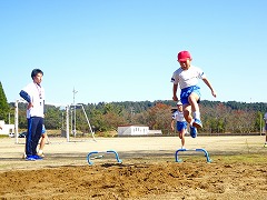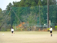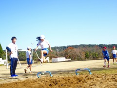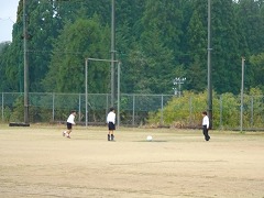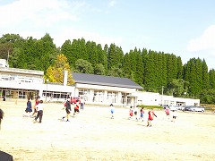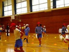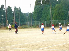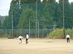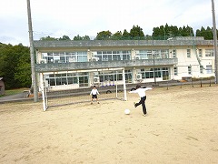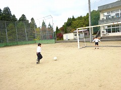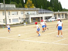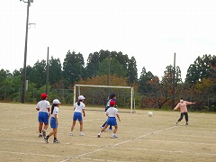 ↓ 3年生対4年生のサッカーゲームです。先生方も加わっています。さて、どちらが勝ったのでしょうか。得点方法に工夫があるようです。