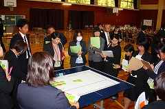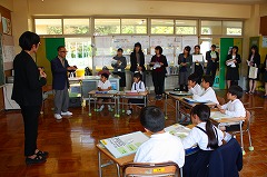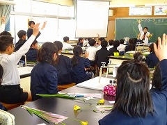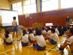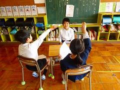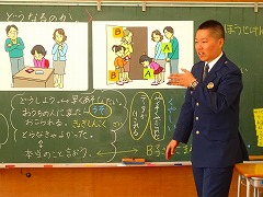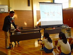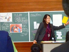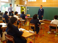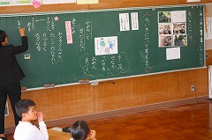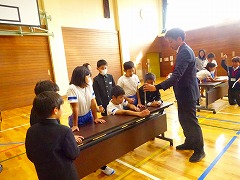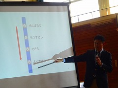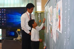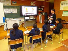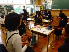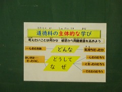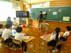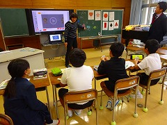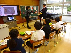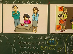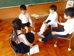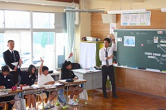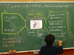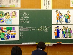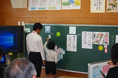 ↑ 講師による師範授業。誠実な生き方について考えました。はじめは、大劇場よりもその男の子のために手品をしてあげたいという思いに共感していた児童であるが、「大劇場で手品をすることが夢なんだよ、そんなに簡単に夢をあきらめてもいいの」という問い返しに、多数の児童は、やはり大劇場で手品をする方に考えを変えました。この手品師は、どんな思いで男の子の前で手品師をすることを選んだのか、考えを深めていきました。