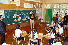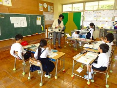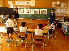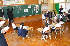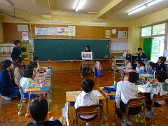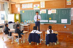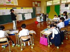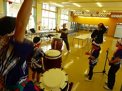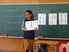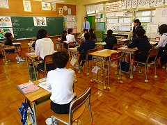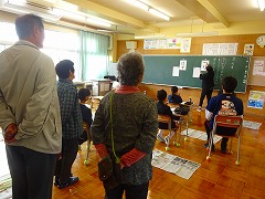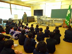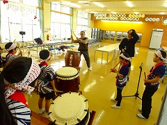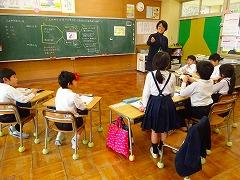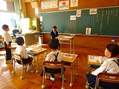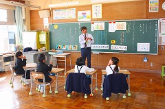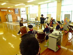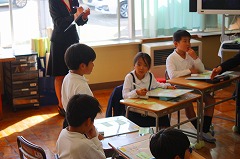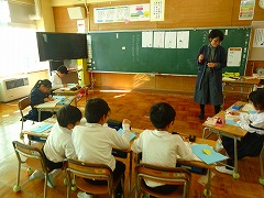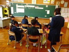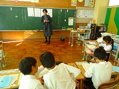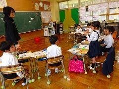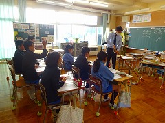 ↑ 2年 地域に伝わる伝統文化や生活に親しもうとする心情を育てる学習です。たいこを大人の人はどのような思いで教えているか、ゲストティーチャーのお話を聞いてさらに深めました。