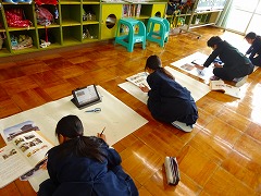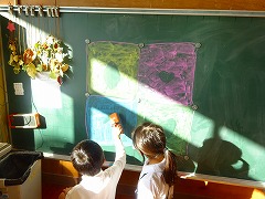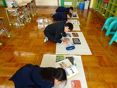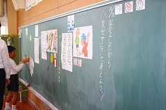 ↑ 1年生活科 入学してから1年間、どんなことがあったか振り返りをしています。夏にはプールで思いっきり水遊びをし、秋にドングリを見つけて、ドングリごまをつくり、冬には6年生を送る会で大きなかぶの劇をしました。たくさんできた思い出から特に心に残った出来事を絵日記に残しました。