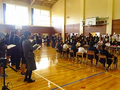 ↑ 卒業生と在校生、職員で最後の「別れの言葉」を交わしました。たくさんのお手本ありがとうございます。6年生の思いを受け継ぎ、ますますよい笠野小学校をつくっていきます。6年生9人で美しく「旅立ちの日に」を歌いあげました。