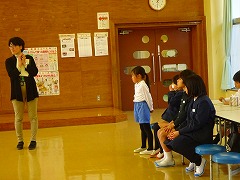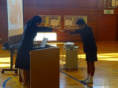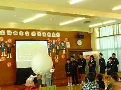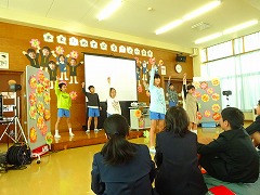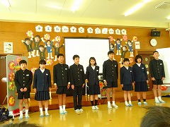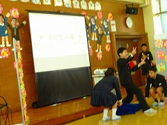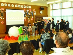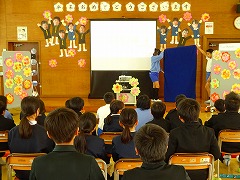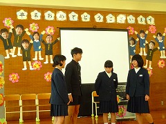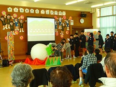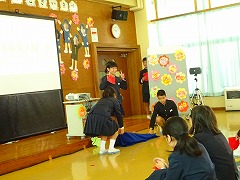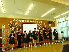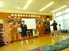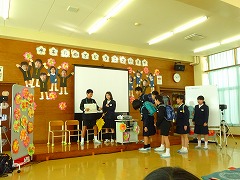 ↑ 6年生が自作の劇を披露してくれました。「みんな知ってる?6年生の日常」です。地域の人に礼儀正しくあいさつをして登校し、授業を一生懸命頑張り、休み時間は委員会の仕事をし、放課後は、楽しいトークをして1日を振り返る、そんな中で、責任感が育ち、みんな以前よりもずいぶん変わったそうですよ。