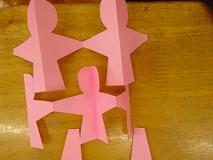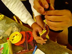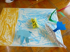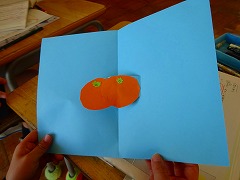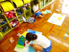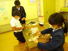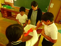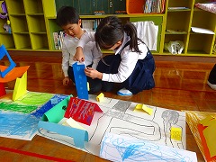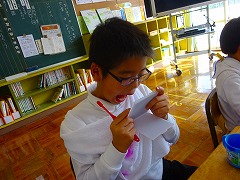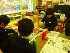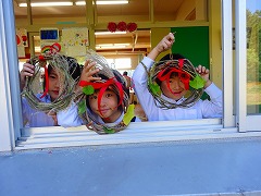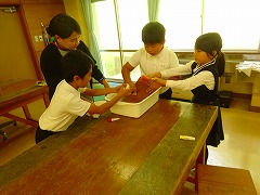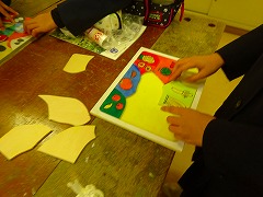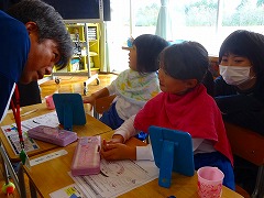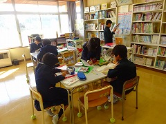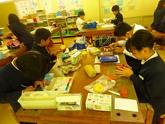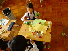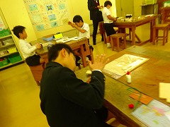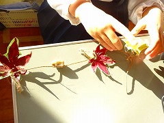 ↓ 1年生が「秋」を使って、わくわくパーティーのプレゼントづくりをしています。工夫をして、畑の先生に喜んでもらおうと、思いを込めて作っています。
