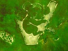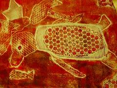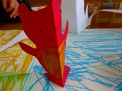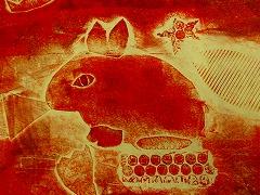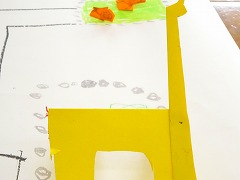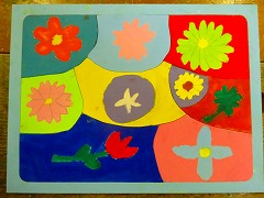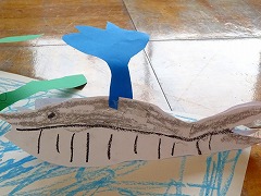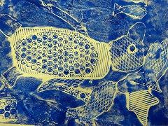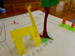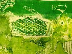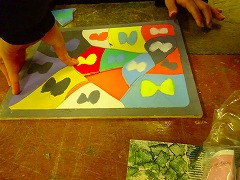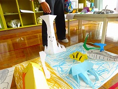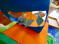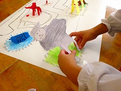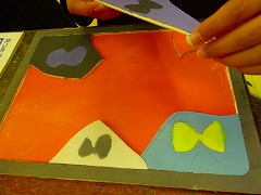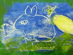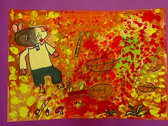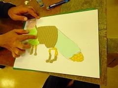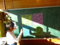 ↑3年生の図工です。動物の紙版画をつくりました。いろいろな色での印刷を試しています。