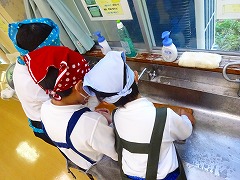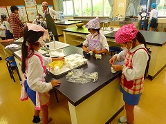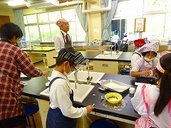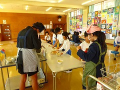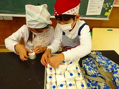 ↑ わくわくパーティーのサツマイモスイーツ作りです。畑の先生のお礼や新1年生の皆さんにプレゼントします。心を込めて作りました。