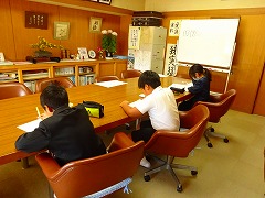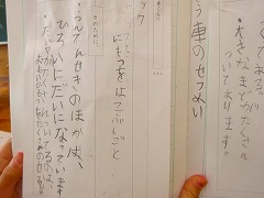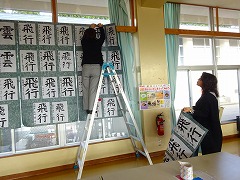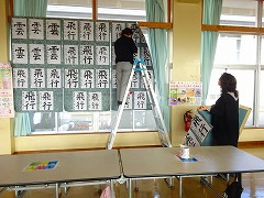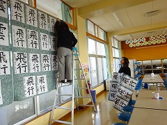 ↑ 河北郡市作品展書写(高学年)の準備です。力作が勢ぞろいです。↓