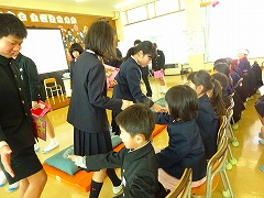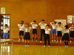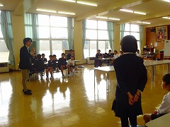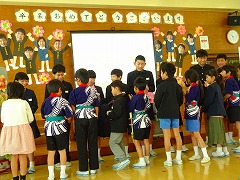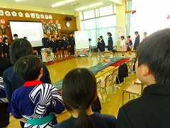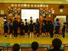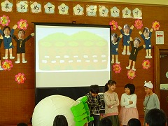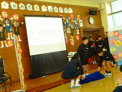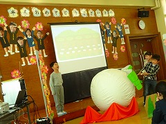↑ 次は、1年生による劇「大きな かぶ」です。大きなかぶになったのですが、1年生は4人しかいないことに気づき、どう考えても「犬」までしか役になる人はいません。「困ったなあ」「これまで助けてくれた6年生は卒業してしまうし・・・」「でも、いつも絶対助けてくれる6年生の力をもう一度借りて、…とうとうかぶはぬけました。」「めでたし、めでたし」1年生の張りのある声に驚きました。1年生はこの1年間、6年生にたいへんお世話になり、ここまでたくましく成長しました。これからは、新しい1年生のために、力を発揮してください。