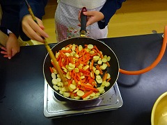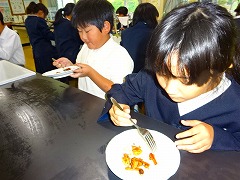↓ 5,6年生は津幡ブランドのまこも料理に挑戦しました。器用な手つきで皮をむき、炒めて、「鶏肉とまこものオイスターソース炒め」の出来上がり!子供たちのおすすめ料理です。今後、これをパンフレットに載せ、PR活動を進めていく予定です。