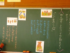 ↑ 1年道徳 がんばる心について考えました。なかなかいい音が出ないこぐまくんの「もうやめたいな」という気もちに共感していた子供たち。「でも、どうしてやめずに続けたのかな」と尋ねると、「小鳥さんたちにアドバイスをもらえたから」、「音楽隊の他の動物たちに悪いから」、「一緒にいい演奏をしたいから」、「やっぱりいい音を出したいから」等、がんばる心になるひみつを考え話し合いました。