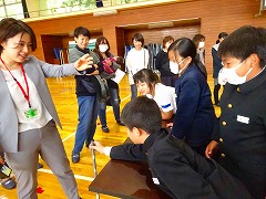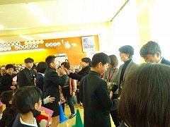 ↑ 教室で荷物を整え、校長室で記念写真を撮り、玄関へと向かいました。すると、…懐かしいお客様です。卒業生へお祝いのメッセージを届けに来てくださいました。