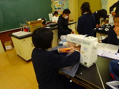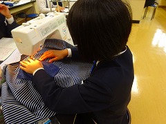 ↑ 5.6年家庭科 エプロン作り いよいよ大詰めです。ポケットに取り掛かかっています。ほつれないようにしっかりつけました。