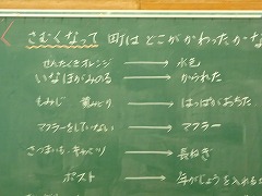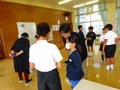 ↑ 2年道徳 キャンディチャートという思考ツールを用いて、行動の奥にある思いを考え話し合いました。さらに、昨年体験した「声掛けボランティア」のことを思い出し、声をかけることは人の役に立ったのか、その理由を生活と結び付けて考えることで、やっぱり、避難所で声をかけてあげたいという思いを確かなものにすることができました。