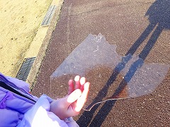 ↑太陽に温められ、空気が膨張し、自然に出来上がったシャボン玉。石鹸水のボトルです。4年の理科の実験と同じことが生活の中で起きていました。