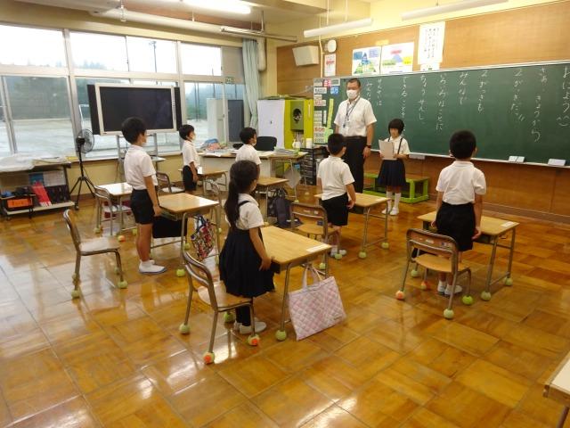今日はかなり涼しくなり、みんな朝から元気に登校してきました。なんと今日は2学期になって初めて全校児童32名全員が登校しました。全員そろうのはやっぱりうれしいものです。