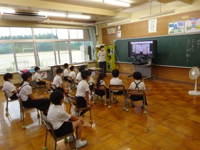 本校の1年生が輪島市立門前西小学校の1年生5名とオンラインで交流しました。国語科で作ったクイズをお互いに出し合う授業です。同じクラスのお友だちではない他校の児童に出題することで、モチベーションが上がりよい刺激にもなります。子どもたちは、きりっとした態度とわかりやすい話し方で出題することを心がけていたようです。