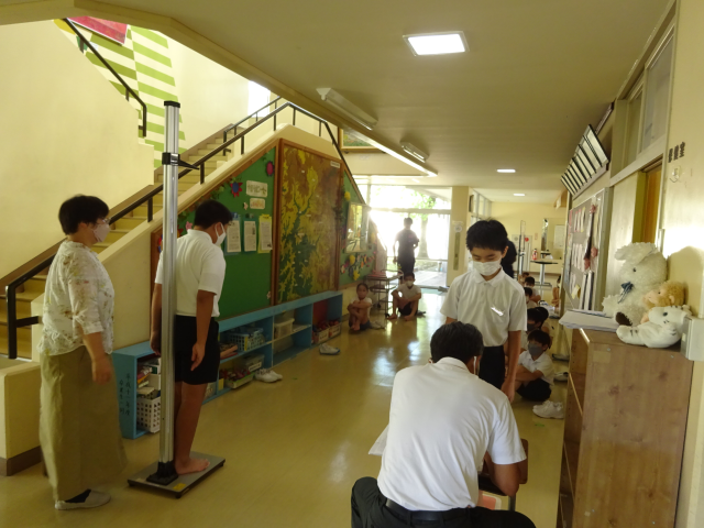 昨日から身体計測が始まっています。始業式の日に「みんな大きくなったなあ。」と感じたとおり、夏休みの間に身長がかなり伸びた子もいるようです。畑では、ヘチマも大きくなっていました。