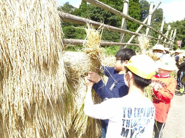 5月に植えた苗が大きく生長し、収穫の時を迎えました。立派な実(お米)をつけた稲は、横になり、穂は地面を向いていました。3年生以上が参加して稲刈り体験をしましたが、稲刈り終了後には、落ちている稲穂を拾い集め、お米を無駄にしない学習もしました。お米を天日干しするための「かさかけ」といす作業も体験しました。