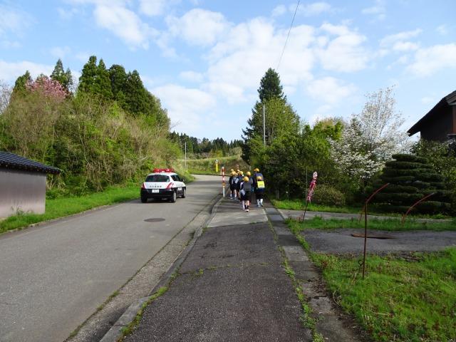 本校は海抜59.9mの高台にあるため,登校時にはかなりの距離の坂道を歩いてきます。高学年リーダーを中心に,まだ慣れない新1年生の歩くスピードに合わせて,どのグループも安全に歩いていました。とても微笑ましい光景です。パトカーも安全パトロールに来てくれていました。