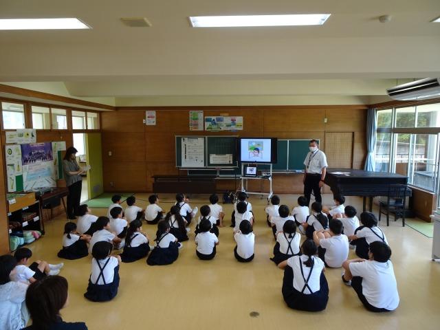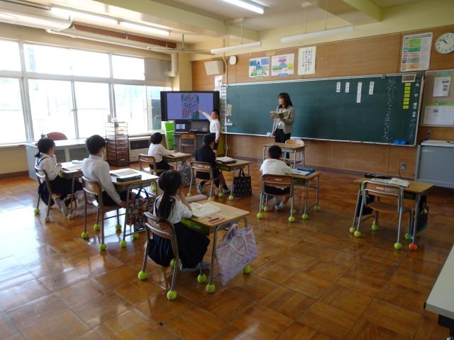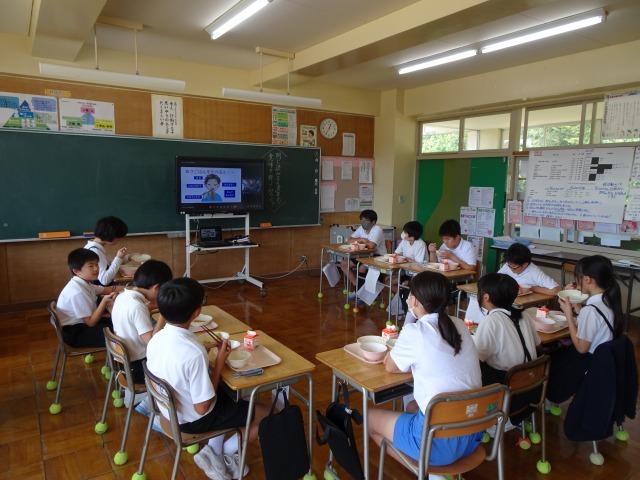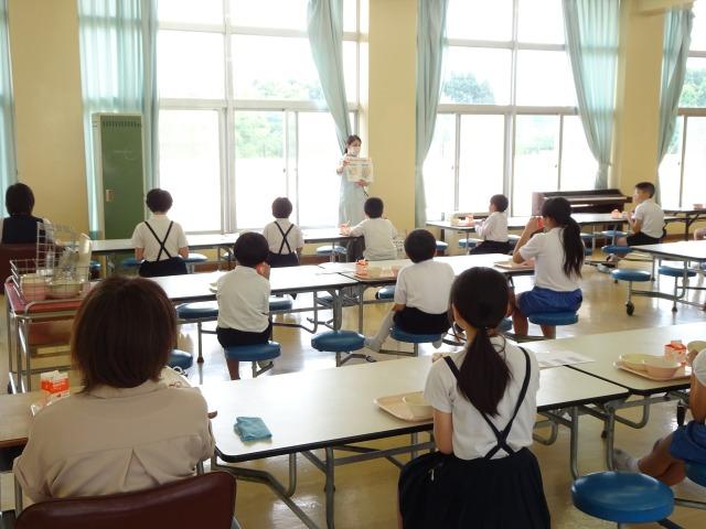 給食時間に萩野台共同調理場の栄養教諭から「手洗い」と「よくかむこと」について教えていただきました。水に流すだけでは手はきれいにはならないことや,よくかむことで唾液が多く分泌され,むし歯の予防にもつながることなどを学びました。ありがとうございました。