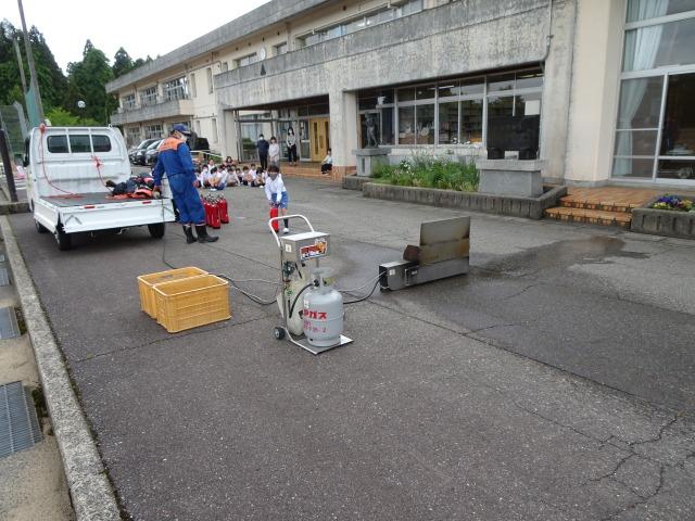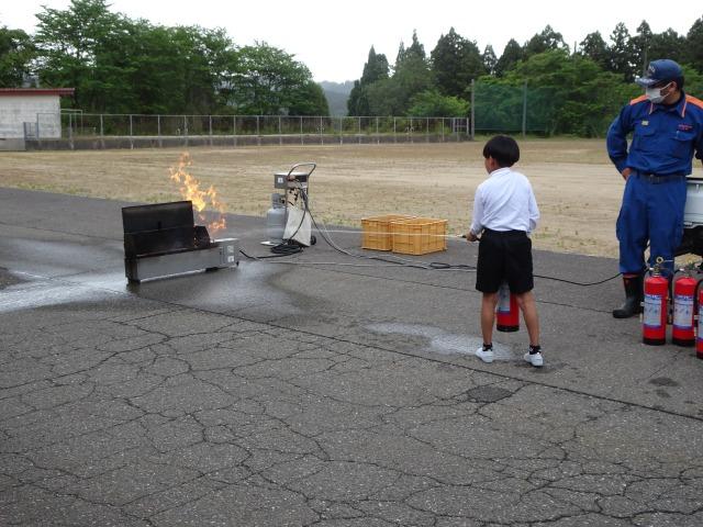 授業中の校内火災を想定して避難訓練を行いました。避難開始の合図から2分でスムーズに全員が避難することができました。津幡町消防本部の方のご指導で,消火器体験もさせてもらいました。