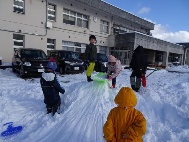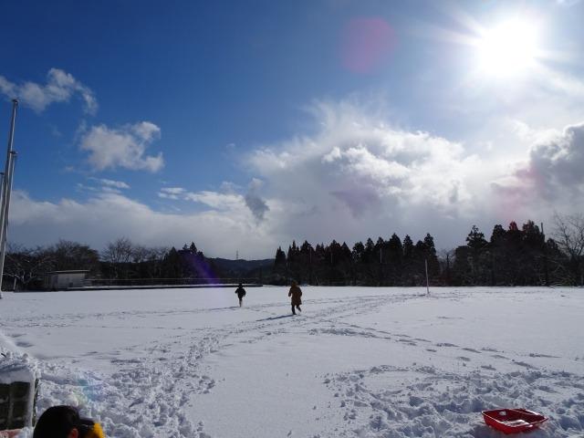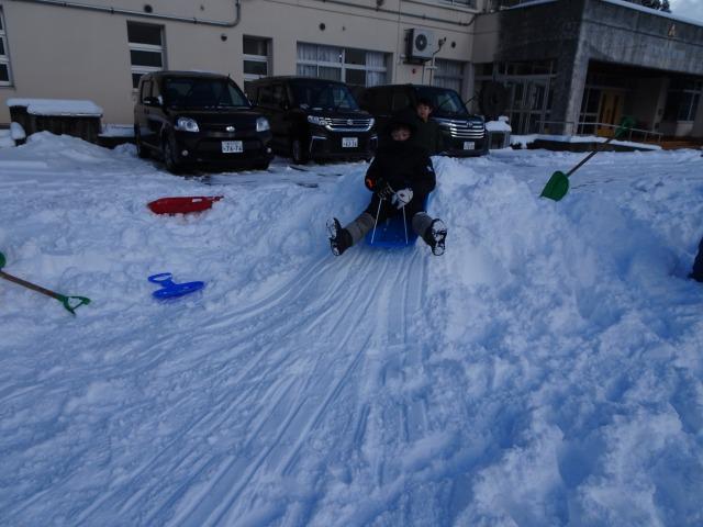 外から歓声が聞こえてきました。見てみると,1年生とあじさい学級の児童が雪遊びをしています。寝転んだり,雪玉を作ったりしていました。小さな雪山を作ってそり遊びもしていました。とっても楽しそうでした。