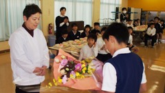 春に植えて、9月に稲刈りしたみんなの笠野米。30kgが5袋、総重量150kgのはざ干しの新米を、JAの方が届けて下さいました。25日の給食時間にお披露目をしました。普段見る機会の少ない、大きな米俵に興味津津の子ども達でした。ということで来週半ばからの笠野給食は、いよいよみんなの笠野米コシヒカリ!新米はかめばかむほど甘味が感じられるといいます。よーく噛んで、笠野の台地の恵みをみんなカミカミして味わいましょう。(甲部)