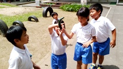 この日は,錆が出ていた遊具のペンキ塗りが行われていて,その作業の後,シーソーを撤去するとのこと。1・2年生たちは,それを聞いて,慌ててシーソーをしていたというわけです。また,この日,1・2年生のキュウリが初収穫を迎えました。みんなうれしそう。曲がった形から,「電話みたい」だそうです。明日の天気が悪いとの予報で,午後のペンキ塗り作業は,1人増えて3人になっていました。