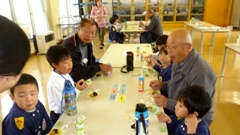 後半(3・4限)は,野菜作りに尽力してくださった畑の先生と笠谷保育園の4~5才児さん,来年度就学予定のお子さんを招待して,わくわくパーティーを行いました。1・2年生の子供たちが手作りしたおもちゃでいっしょに遊んだり,作りたてのサツマイモのお菓子をいただきながら,おしゃべりしたり,楽しい一時を過ごしました。参加してくださった皆様,ありがとうございました。(神村)