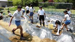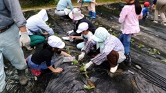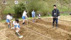 1・2年生が,畑に出て,野菜(と花)の苗を4.3畝分植えました。植えたのは,2畝も植えたさつまいも30本のほか,枝豆,キュウリ,ミニトマト,トウモロコシ,ひまわり,ホウセンカ,金時草です。お世話いただいた畑の先生方と,当日参加くださったPTA環境部長の柴木さんも,できるだけ1・2年生たちに活躍してもらおうと,裏方に徹してくださいました。おかげで1・2年生たちは,本当にたくさんの作業を自分たちの手で行い,充実した時間を過ごしました。ちなみに,余った1.7畝分の(昨年は,何も植えずに放置していた)スペースに,学校分として,苗(キュウリ,トマト,カラーピーマン,ナス,スイカ)を植えました。しっかりお世話していきたいと思います。
