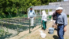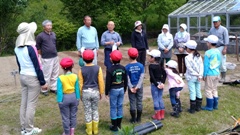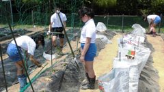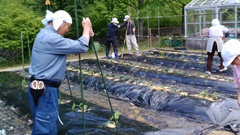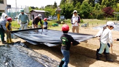 しかし,畑の先生方の仕事はまだまだありました。イノシシ等の動物から畑を守るネット張りです。昨年は,四隅にしか支柱を立てなかったため,イノシシにネットを破られてしまいました。そこで今年は,さらに15本の支柱を追加。完璧な備えを構築しました。「さあこい,イノシシ。入れるものなら入ってみろ!」です。しかし,作業時間はまたもや長時間に及び,10時20分から13時20分まで,休憩なしで3時間にもなりました。畑の先生方,これまでも含め,本当にありがとうございました。今後は,しっかり水やりと草抜きに努めます。秋の収穫祭には,是非おいでください。