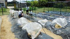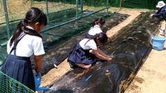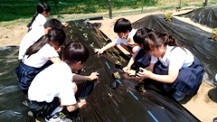 5・6年生が,2回目の苗植えを行いました。今回植える野菜は,キュウリ,スイカ,枝豆。前回作っておいた畝に植えました。ちょうど太陽が一番高い時間帯で,しかも,7月中旬の暑さ(ニュースより)でもありましたが,11名が協力し,無事植え終わりました。