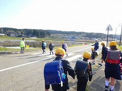 ↑ 雨の日も、風の日も、そして晴れの日もあります。上級生は1年生のペースに合わせて歩いていました。小さい子を思いやる優しさと上級生としての頼もしさを感じました。地域の皆様、見守りありがとうございます。