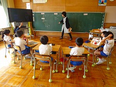 ↓ 入学式 教室で担任の先生と初めてのお勉強をしています。