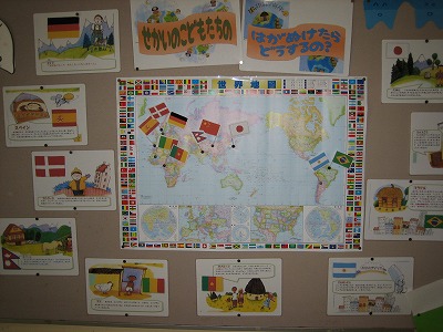 5月の歌の「せかいじゅうのこどもたち」にからめて、今回は世界中の子どもたちの「はがむけたらどうするの?」の掲示です。色んな国の子どもたちの抜けた乳歯の行方をまとめた本の中から、様々なエピソードをピックアップして国旗とともに貼り出しました。さてどの国のこどもの歯の行方でしょうか? またご家庭でも話題にしてくださいね。