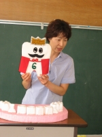 6月16日の3限目、歯科衛生士の藪安恵先生に来ていただいて、「歯みがき教室」を実施しました。参加者は1年生の7人と登美先生です。