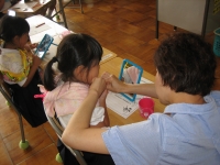 かわいいお人形や、大きくて見やすい手作りの歯の模型を使って、まず6歳臼歯の大切さ、怖いむし歯になる原因を分かりやすく教えていただいたきました。その後むし歯を予防する大切な歯みがき方法について、染めだしを実際に行って、その場で自分のみがき残しを確認しながら、個別指導でみがき方を教えてもらいました。