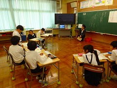 ↓ 3.4年生の授業を1.2年生が見せていただきました。発表の仕方、説明の仕方、意見の聞き方等、上級生から直接学びます。また、上級生は、下級生の授業を見にいって、説明の仕方や発表の仕方をアドバイスします。「子連れ参観」と言って、先生だけではなく子供同士が学び方を互いに学び合うよい学習の場となっています。