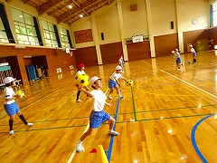 ↓ 1.2年生合同体育 ボール投げ&キャッチの練習です。そして、ボールキープゲームでジグザグドリブルをしてボールを使った運動に慣れました。