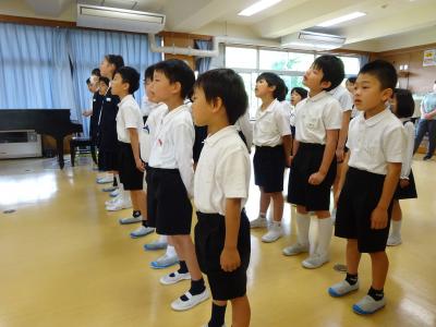 1学期の終業式。まず,校歌を元気に歌いました。そして,校長から「自分で考える夏休み」として,1・やりたいことチャレンジ 2・命を守る について話がありました。最後,生徒指導から「日・月(規則正しい生活・熱中症に気をつける)火(火遊び×)水(水の事故に気をつける)木(自然に親しむ・くまに注意)金(お金や物のやり取り×)土(交通事故に気をつける)」という話がありました。下校する時は,全員ハイタッチをしてにこにこ笑顔で帰りました。元気に夏休みを過ごせることを願っています。