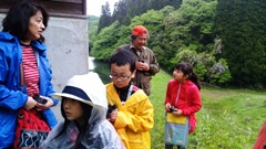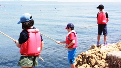 3日目だというのに,みんなとっても元気。疲れているのは先生方だけのようです。最後の活動は,釣り。橘先生にお世話になり,昨日の追跡ハイキングの目的地である赤崎灯台周辺の磯で,思い思いに釣り糸を垂れました。釣果は,児童3匹,先生2匹,計5匹だったとか。期待していたより少なめでした。残念。釣れた皆さん,おめでとうございます。ちなみに,釣った魚は,みんなでしっかり眺めてから,海へリリースしました。(アブラメが多かったです。食べると,とっても美味しい魚です。)
