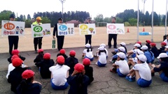 朝方からの雨が降り続き,時に激しく降ったこの日。昨年の体育館での交通安全教室を思い出し,今年もまたかという雰囲気でした。しかし,諦めずにぎりぎりまで判断を保留。(津幡警察署,交通安全協会の担当者の方々に,判断を待ってもらっていました。)そして,11時30分になり,ついに雨が止みました。天気予報では,これから晴れてくるとか。運動場の準備解禁です。午後1時30分。運動場にて,交通安全教室は,無事開催されました。