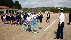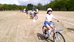はじめに,津幡警察署の米倉さんから,防犯標語「いかのおすし」について教えてもらいました。「いかのおすし」とは,「(ついて)行かない,(車に)乗らない,大声でさけぶ,すぐにげる,知らせる」のかしら文字をとったものです。次に,昨年も来ていただいた生活安全課長の海道さんから,自転車の安全な乗り方について教えていただきました。その後,5年生のMさんが自転車実施訓練の見本を引き受けてくれたので,その様子をみんなで観察。その後,自転車実施訓練と歩行訓練に分れ,晴れ渡った春の運動場を,真剣に練習しました。児童の安全のために,米倉さん,海道さんのほか,倶利伽羅駐在所の金谷さん,交通安全協会の中川さんが,コースの要所に立ち,アドバイスしてくれました。最後に再び海道さんに講評をもらい,交通安全教室は終わりました。お世話いただいた皆さん,ありがとうございました。